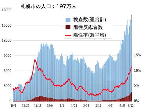 陽性検査された者の一定割合は,陽性を現す。 よって,検査数を増やせば,陽性者数が増える。 逆に,陽性者数が増えているときは,検査数が増えているときである。 札幌市 (札幌市保健所「札幌市における感染状況について (令和3年5月13日)」より)