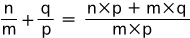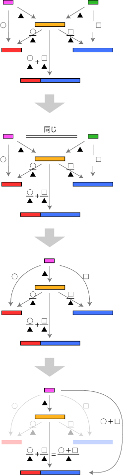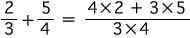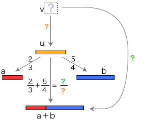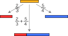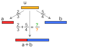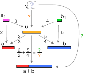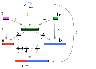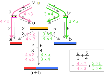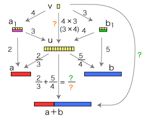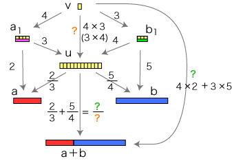 ![]() この関係が成り立つようにするには,分数の和をどのように定めたらよいでしょう? そこで実際に「2/3 + 5/4」が表す分数を求めてみます。 通分 量vは,「a1, b1 に共通の分割を求める」という方針で求めています。 vを得て,このvから 比 2/3 : u→a,5/4 : u→b を見るとき,2つの比はそれぞれ ( 4×2)/( 4×3), ( 3×5)/( 3×4) になっています。 特に,(2/3) + (5/4) は,( 4×2)/( 4×3) + ( 3×5)/( 3×4) になります。 ![]() これは何を意味しているでしょう? 「a1, b1 に共通の分割を求める」は,「分数 2/3,5/4 を通分する」に対応するということです。 つまり,つぎの形をつくっているわけです: ![]() この形の和の場合,求和公式はつぎのようになります: ![]() 以下が,この求和公式の理由です: ![]() 旧ページ